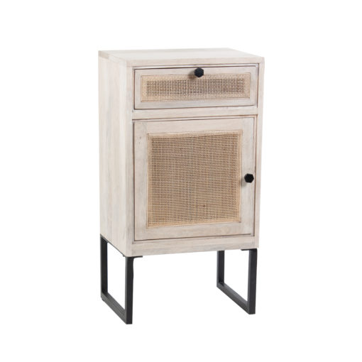 Vaaleaksi käsitelty yöpöytä mangopuuta, jossa 1 laatikko ja 1 ovi.