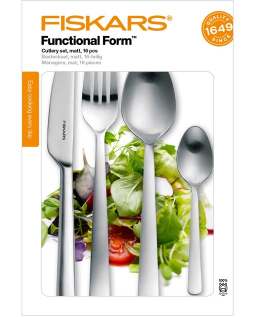 Näppärää muotoilua arjen ruoanlaittoon ja ruokailuun. Tämä 16-osainen Functional Form -aterinsetti sisältää neljä mattapintaista ruokahaarukkaa, ruokaveistä, ruokalusikkaa ja kahvilusikkaa. Aterimien muotoilu on tyylikkään moderni ja käytännöllinen.