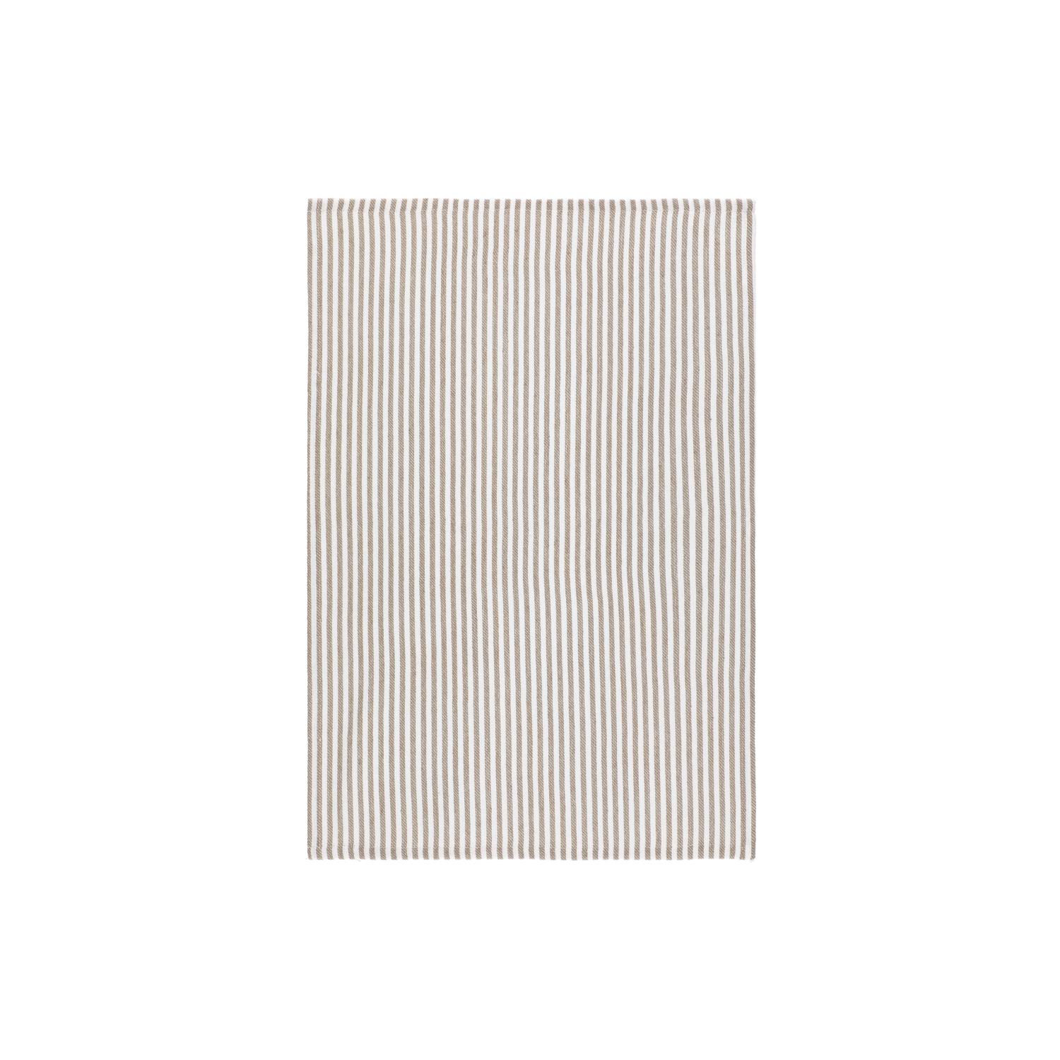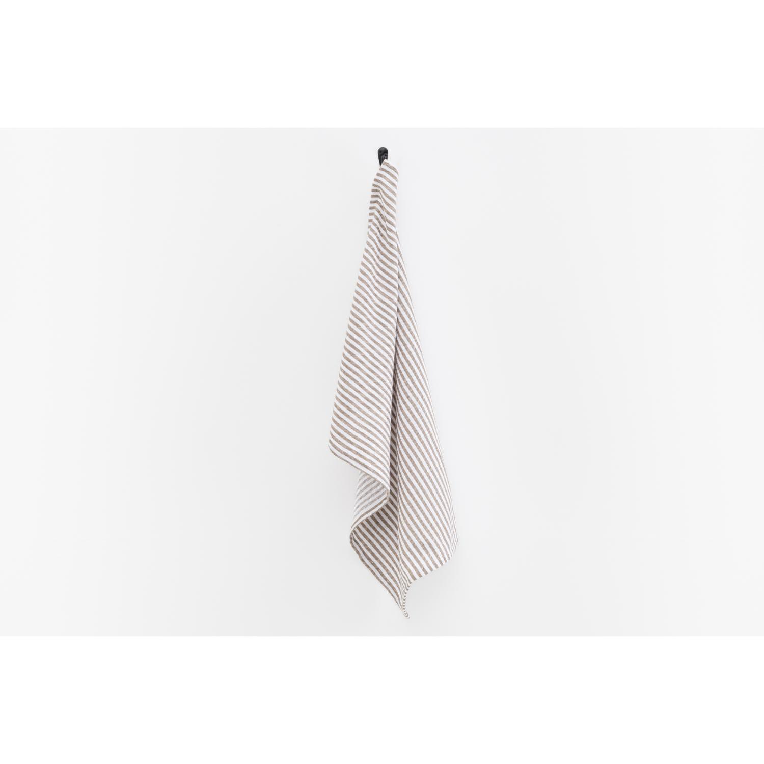 Kierrätyspuuvillasta valmistettu raidallinen keittiöpyyhe.