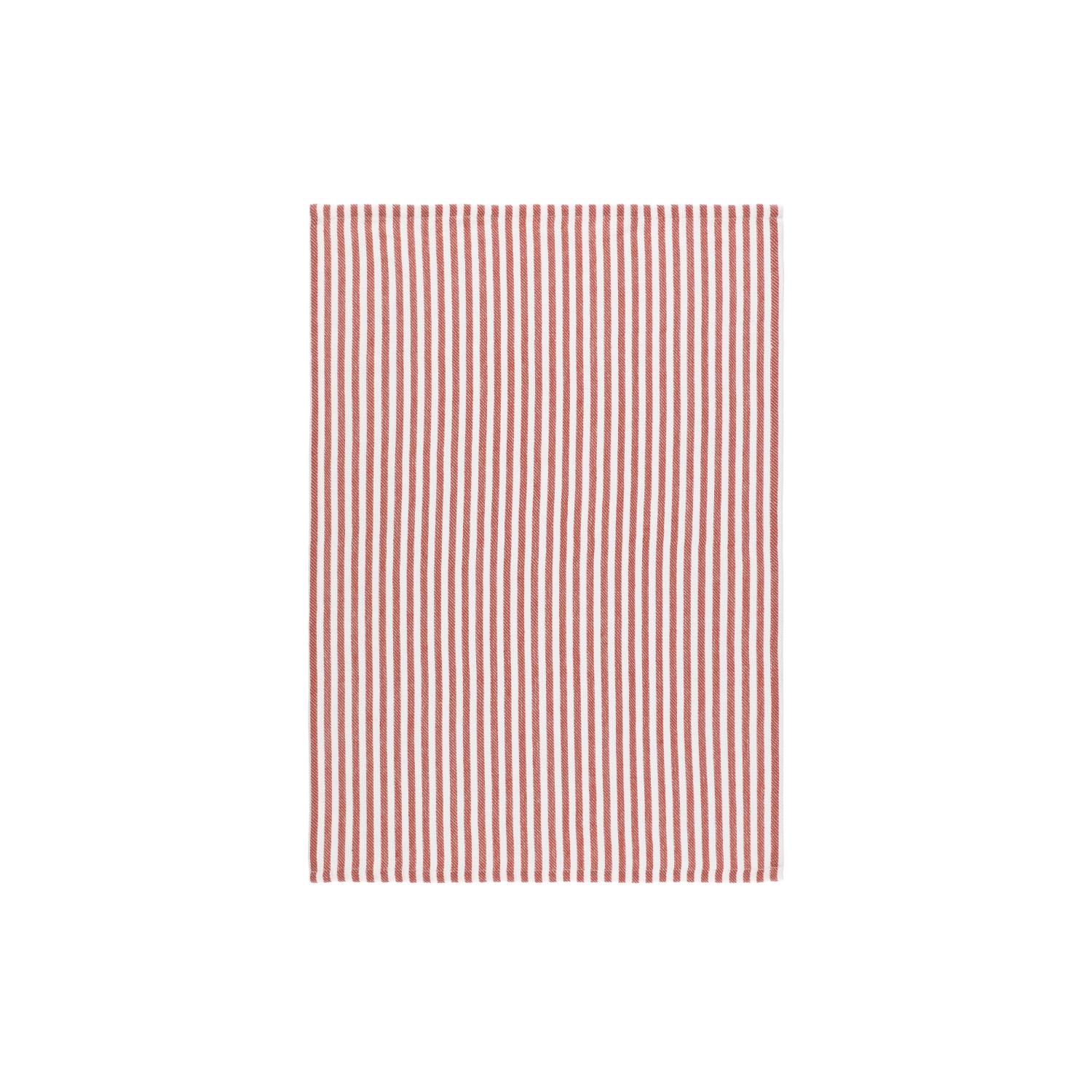 Kierrätyspuuvillasta valmistettu raidallinen keittiöpyyhe.