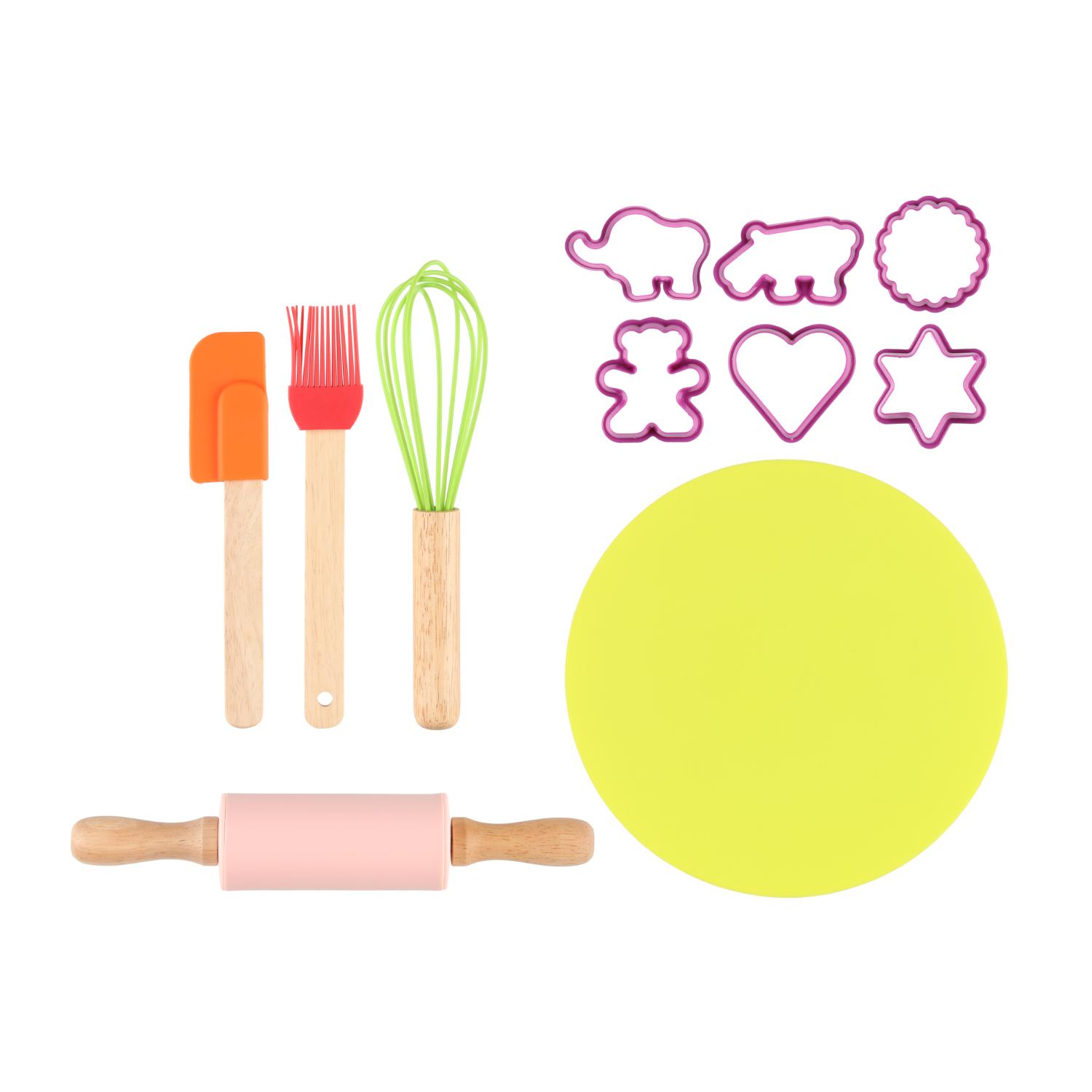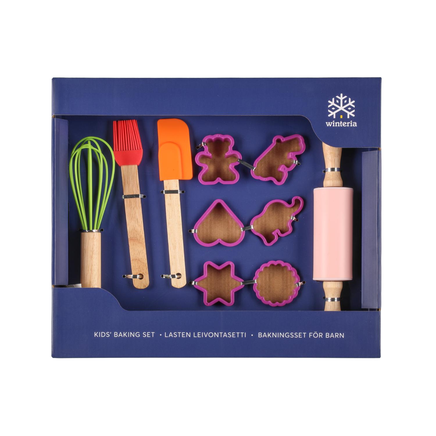 Ihanan värikäs leivontasetti sisältää: nuolija, silikonisuti, pallovispilä, kaulin, leivonta-alusta, 6 erilaista keksimuottia. Käsinpesu.