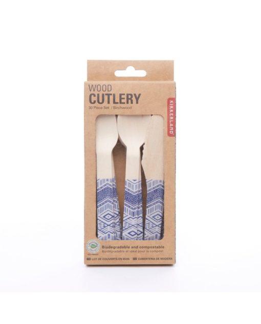 Kertakäyttöiset puu aterimet: haarukka, veitsi ja lusikka.