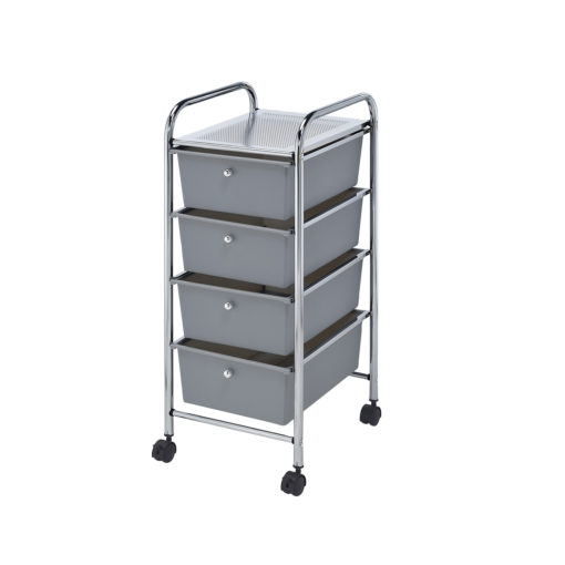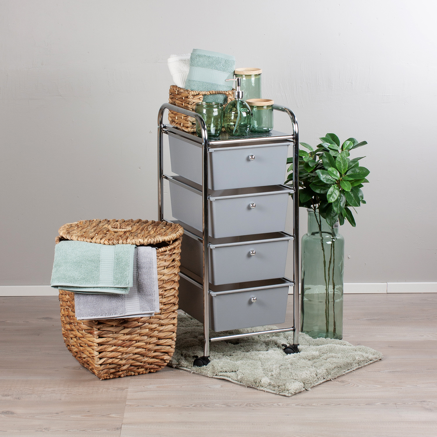 Tyylikäs korivaunu neljällä muovilaatikolla ja pyörillä. Kätevä siirtää paikasta toiseen. Sopii myös kylpyhuoneeseen.