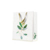 Valkoinen lahjakassi, jossa lehtikuvioita.
