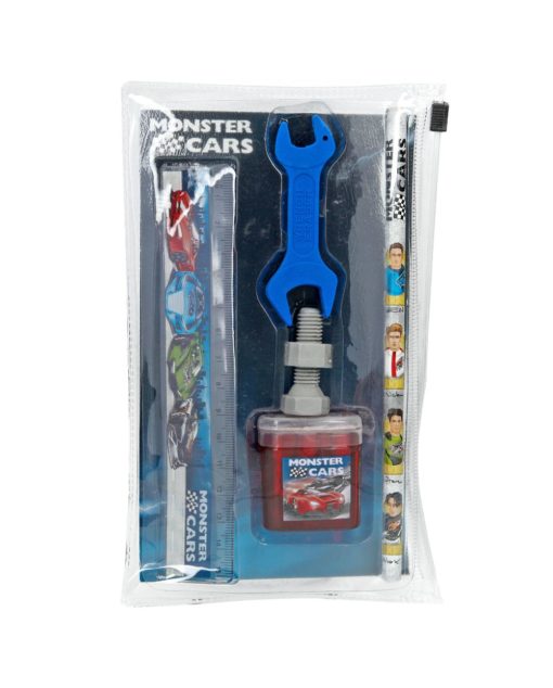 Monster Cars-sarjan kirjoitusvälinesetti, jossa mukana autoaiheiset ja -malliset kaksi pyyhekumia, lyijykynä, viivoitin ja teroitin. Kirjoitusvälineet tulevat kätevässä suljettavassa muovipussukassa.