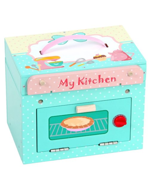 Sininen kannettava leikkikeittiö. Menee kätevästi pieneenkin tilaan.
