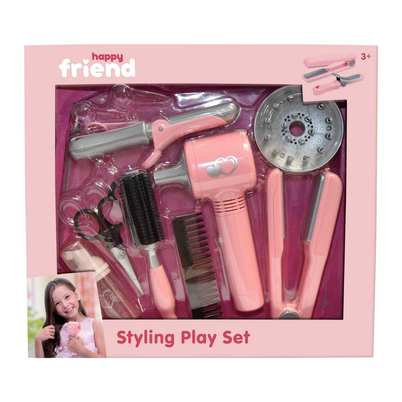 Leikkisetti sisältää tarvikkeita hiustenmuotoiluun.