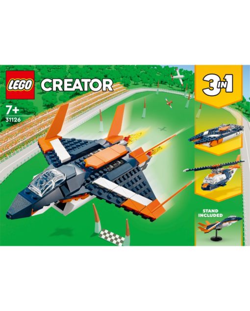 Tämä huikea LEGO® Creator 3in1 Yliäänikone (31126) rakennussetti vie 7 vuotta täyttäneet lapset vauhdikkaisiin leikkeihin yläilmoihin tai vesille. Mukana on huippunopea suihkari, jossa on ohjaamo, sisäänvedettävät pyörät, liekkejä syöksevä moottori ja esittelyjalusta.