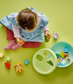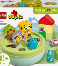 Hauvoja rakastavilla pikkuisilla on kaksi tapaa leikkiä Opetellaan muotoja: Koiranpentujen talo (10441) -lelulla. Tämä hienomotorisia taitoja kehittävä lelu on tarkoitettu yli 1,5-vuotiaille taaperoille-. Se esittelee muotoja ja ongelmanratkaisutaitoja innostavalla tavalla, kun taaperot rakentavat palikoista koiranpennuilleen leikkipaikan ja lajittelevat sitten muotoja pujottaen niitä kannen reikien läpi. Tämä taaperoille tarkoitettu hahmotuskykyä kehittävä lelulahja on täynnä hauskoja oppimistehtäviä koko perheelle. Vanhemmat voivat auttaa setin eri muotojen kanssa, kun taaperot rakentavat niistä puita, koirahahmoja ja jopa talon. Sen jälkeen voitte yhdessä nauttia luovista roolileikeistä söpöjen LEGO® DUPLO® koiralelujen parissa heittäen niille palloa ja tarjoten niille luita. Kun mielikuvitusleikit on leikitty, alkaa erimuotoisten palikoiden lajittelu. Taaperot pääsevät harjoittelemaan kärsivällisyyttä ja keskittymistä yrittäessään pujottaa oikean muodon oikeasta reiästä. Yrityksen ja erehdyksen kautta taaperoiden sinnikkyys ja koordinaatiokyky kehittyvät, kun he yrittävät etsiä muodolle oikean reiän. Sisältää 17 osaa.