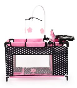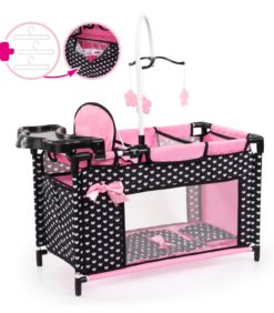 Kaunis nuken matkasänky tarvikkeilla. Matkasänky menee helposti kasaan tilan säästämiseksi.