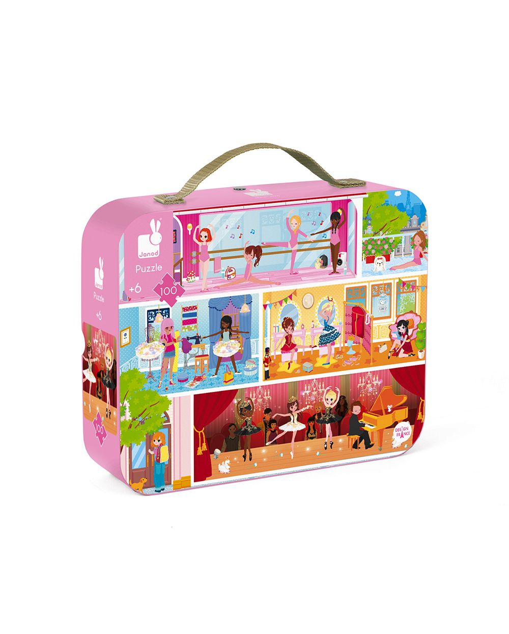 Tanssikoulussa tapahtuu! Kauniin Janod Tanssijat palapelisalkku -palapelin kuvituksessa kurkistetaan tanssikoulun tiloihin. Koulun ylemmissä kerroksissa ballerinat harjoittelevat ja alakerran salissa vieraat pääsevät seuraamaan balettiesityksiä. Upean ballerina-aiheisen palapelin palat säilyvät helposti upeassa salkussa. 100 palaa, paksua kartonkia.
