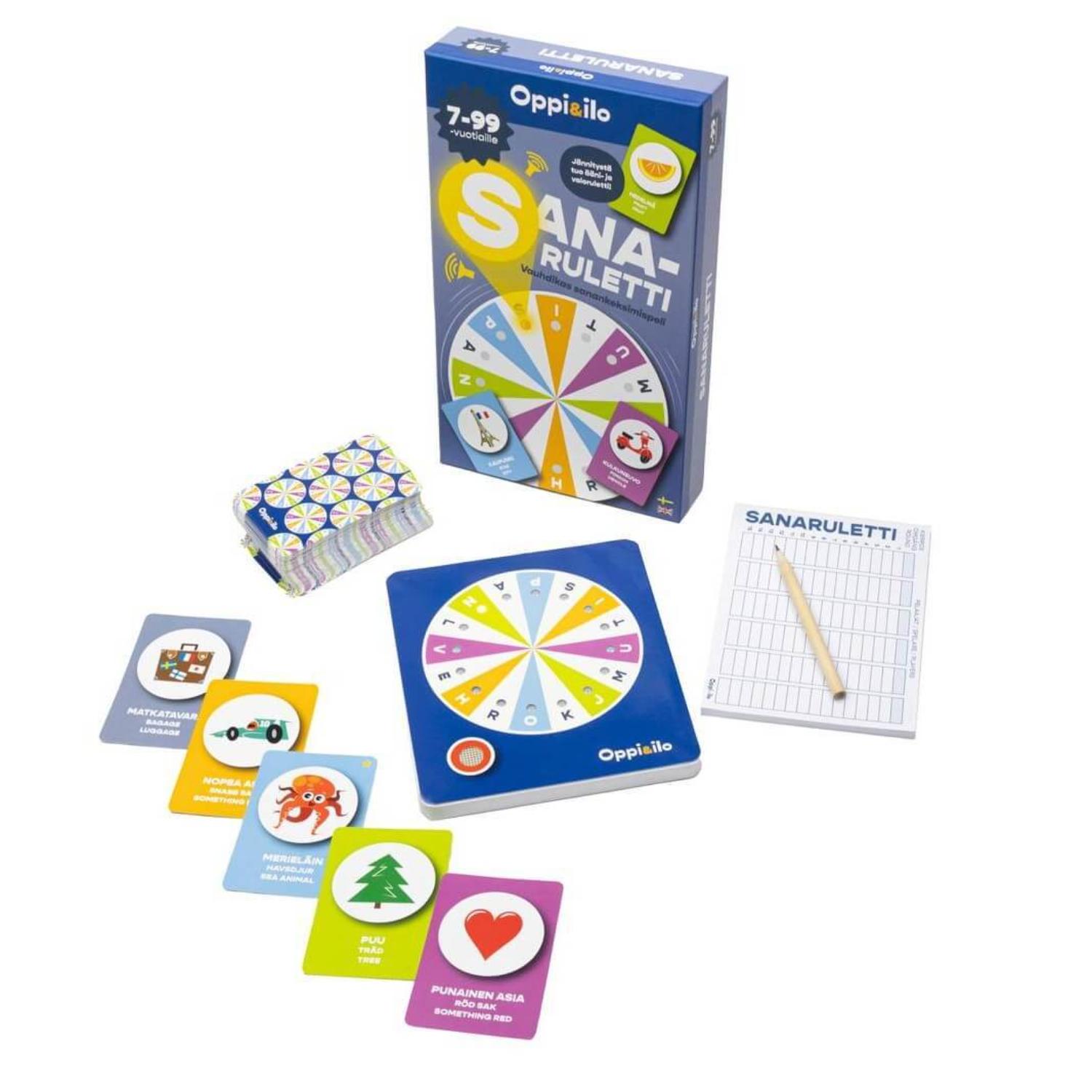 Ääni- ja valoruletti pyörii – mihin kirjaimeen se pysähtyy? Aihealuekortti määrää aiheen. Keksitkö siihen liittyvän sanan, joka sisältää ruletin antaman kirjaimen? Jos onnistut, saat kääntää seuraavan aihealueen. Sinulla on 30 sekuntia aikaa keksiä aihealuekorttien mukaisia sanoja, joissa on ruletin antama kirjain. Sanaruletti on nopeatempoinen, jännittävä ja hauska sanapeli, joka tempaa mukaansa kaikenikäiset pelaajat!