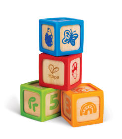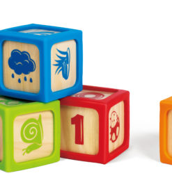 Puisia kuutioita, joissa irrotettava silikoninen reunus. Yhteensä 4 kpl. Palikoissa numeroita, kirjaimia ja kuviointia, 4 eri väriä.Ikäsuositus: 0,5+.