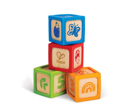 Puisia kuutioita, joissa irrotettava silikoninen reunus. Yhteensä 4 kpl. Palikoissa numeroita, kirjaimia ja kuviointia, 4 eri väriä.Ikäsuositus: 0,5+.