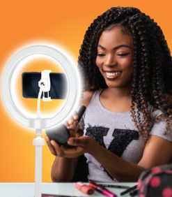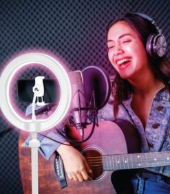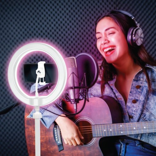 Sisältää säädettävän (max.80cm) jalustan puhelinpidikkeellä, monivärisen LED-rengasvalon, jossa on 12 väritilaa sekä vihreän taustakankaan.