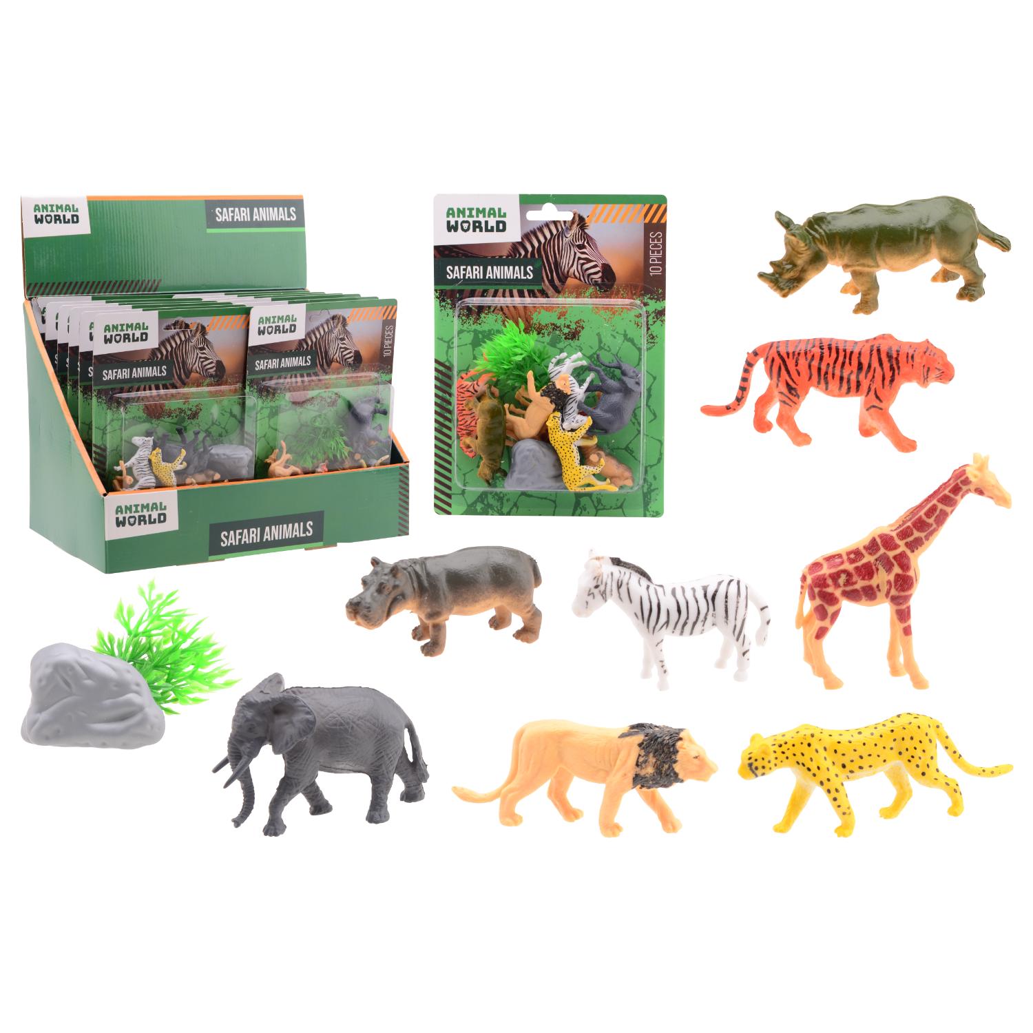 Samassa pakkauksessa koko leikkisetti, kivi ja pensas ja kahdeksan erilaista villieläintä.