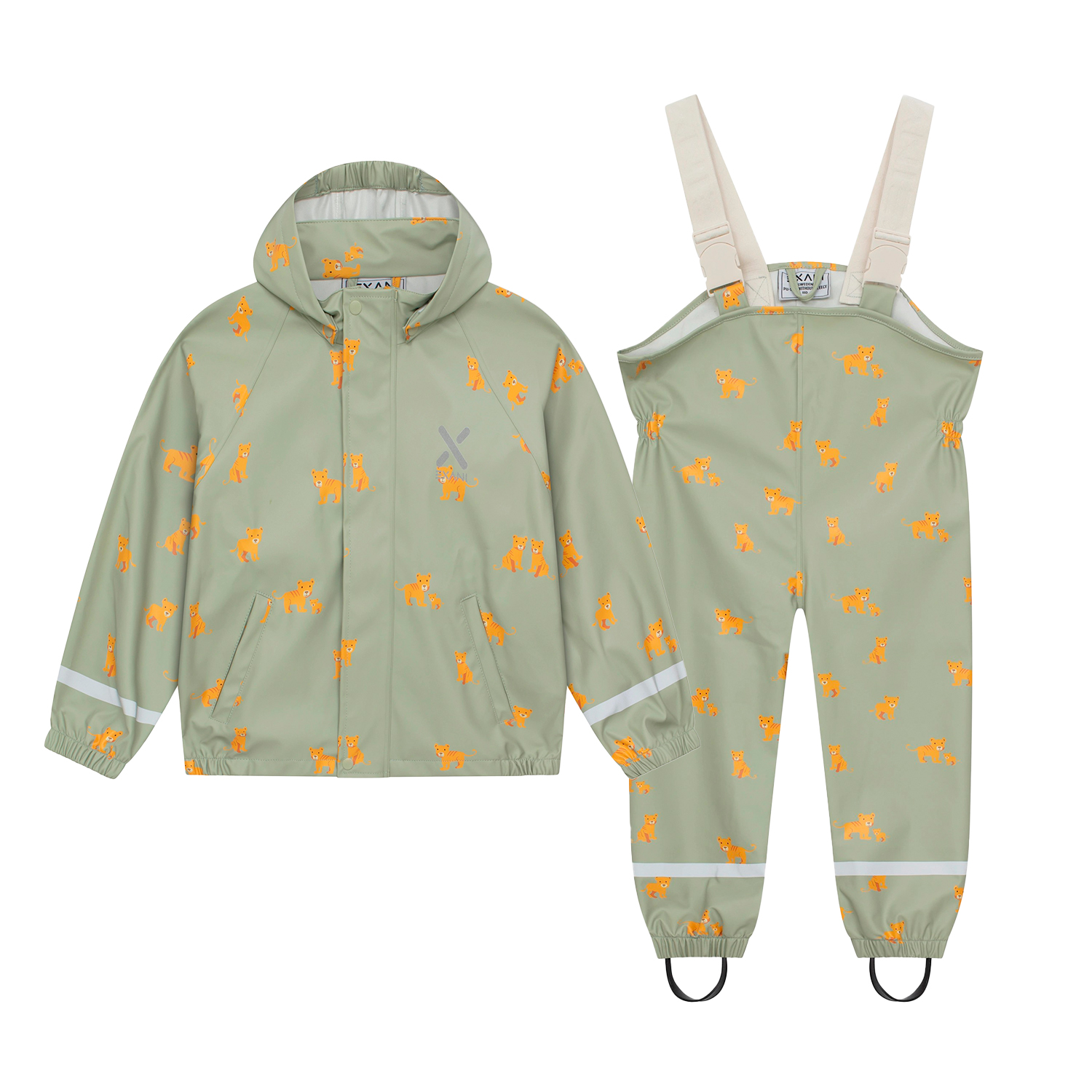 Tuulen- ja vedenpitävä, vuoriton sadeasu leikkisillä kuvioilla.