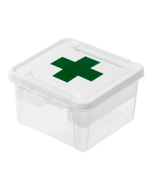 Ensiapulaatikko läpinäkyvillä sisäosilla. Laatikko on sopivan kokoinen säilyttää kylpyhuoneessa, autossa tai miksipä ei veneessä. Kerää laastarit, särkylääkkeet, siteet ja desinfiointiaineet yhteen paikkaan, niin sinun ei tarvitse etsiä onnettomuuden sattuessa.