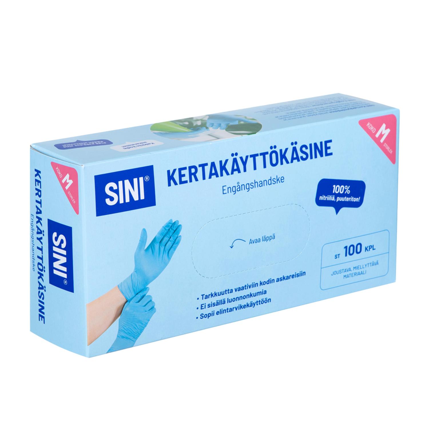 Nitriilikumista valmistettu puuteroimaton kertakäyttökäsine soveltuu myös luonnonkumiallergikoille. SINI-nitriilikäsineet soveltuvat ruoanlaittoon ja elintarvikkeiden käsittelyyn, sillä niistä ei liukene kemikaalijäämiä ruoka-aineisiin. Joustavan tuntuinen luja kertakäyttökäsine on miellyttävän tuntuinen kädessä. Käsine säilyttää hyvän tuntoherkkyyden, joten se sopii myös pikkutarkkaan työskentelyyn. Käsineillä saadaan erittäin pitävä kuivaote. Saatavana M ja L-kokona.