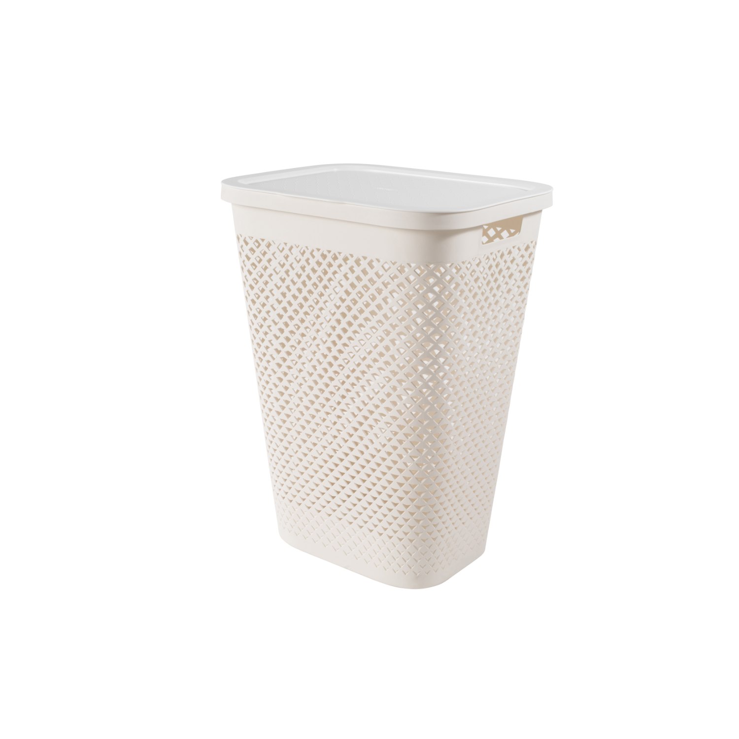 Curver valkoisessa Pure 55L pyykkikorissa on hienostunut ja ilmava geometrinen reikäkuvio. Pyykkikorissa on saranoitu kansi ja kantokahvat molemmissa sivuissa.