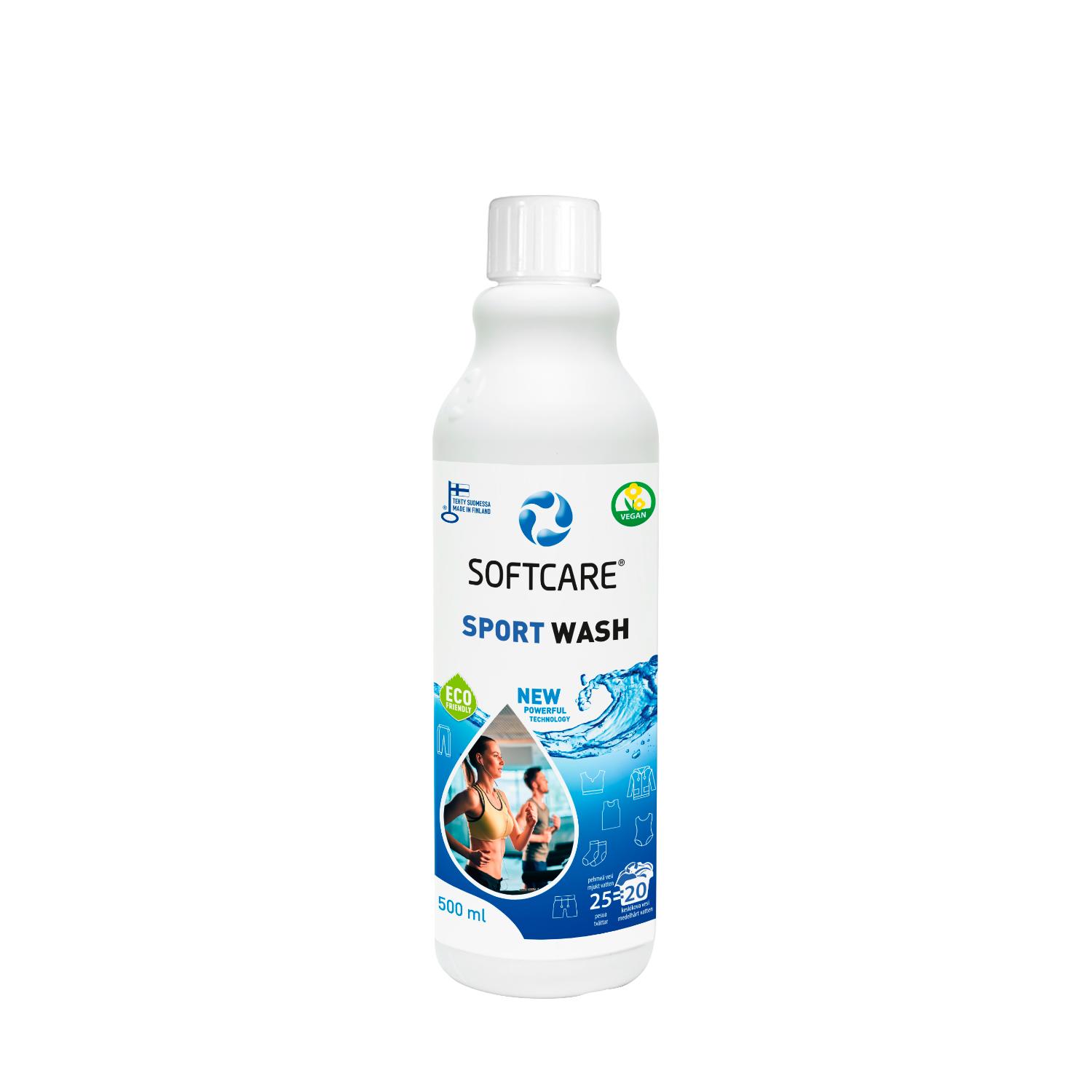 Softcare Sport Wash 500 ml on riittoisa, urheilu- ja muiden tuoksuvien vaatteiden ja tekstiilien pesuun tarkoitettu erikoispesuaine. Se irrottaa vaikeankin lian ja poistaa tehokkaasti epämiellyttävät tuoksut. Sopii myös joustokuiduille ja kalvoasuille.
