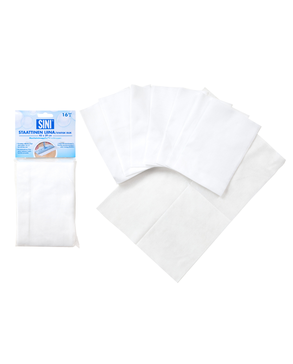 Kertakäyttöinen staattinen liina latautuu pyyhittäessä sähköisesti imaisten pölyn, karvat ja lian itseensä, eikä päästä niitä enää huoneilmaan. Reilunkokoinen liina sopii erinomaisesti myös käsinpyyhintään. Staattinen liina sopii pölyn poistoon kodin kaikilta pinnoilta: huonekaluista, valaisimista, TV-laitteista (sammuta TV), tietokoneista, seinistä, katoista ja lattialta.