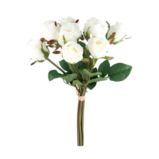 Valkoinen ruusukimppu, jossa 9 kpl tekoruusuja.