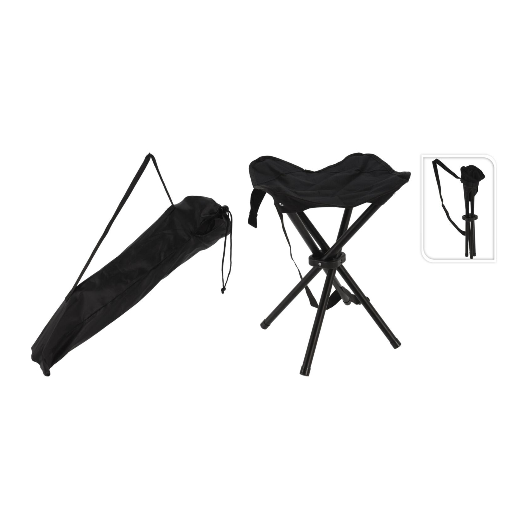 Musta taitettava retkijakkara, jossa kätevä kantakassi.